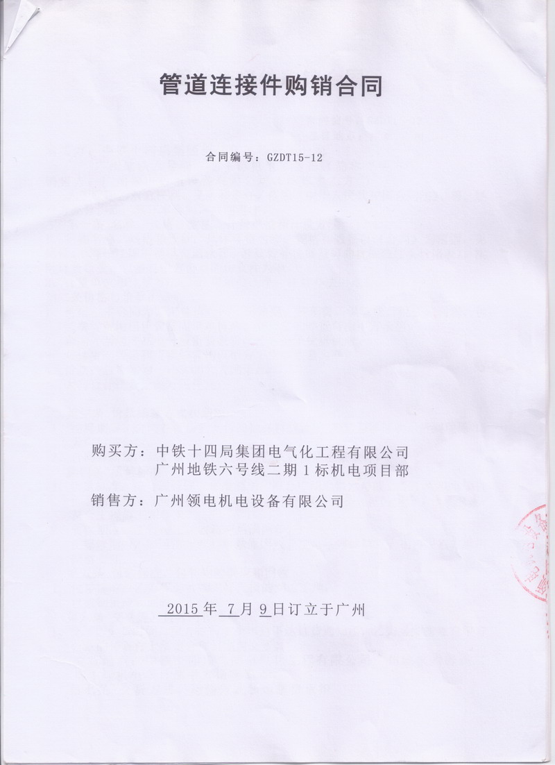 以下為淞江集團委托授權商廣州*電機電設備有限公司與中鐵十四局集團電氣化工程有限公司廣州地鐵六號線二期1標機電項目部簽訂管道連接件購銷合同,該合同為真實有效的,請勿修改,請勿轉載,該合同只作為*貨證明,不作為其他用途,謝謝合作。